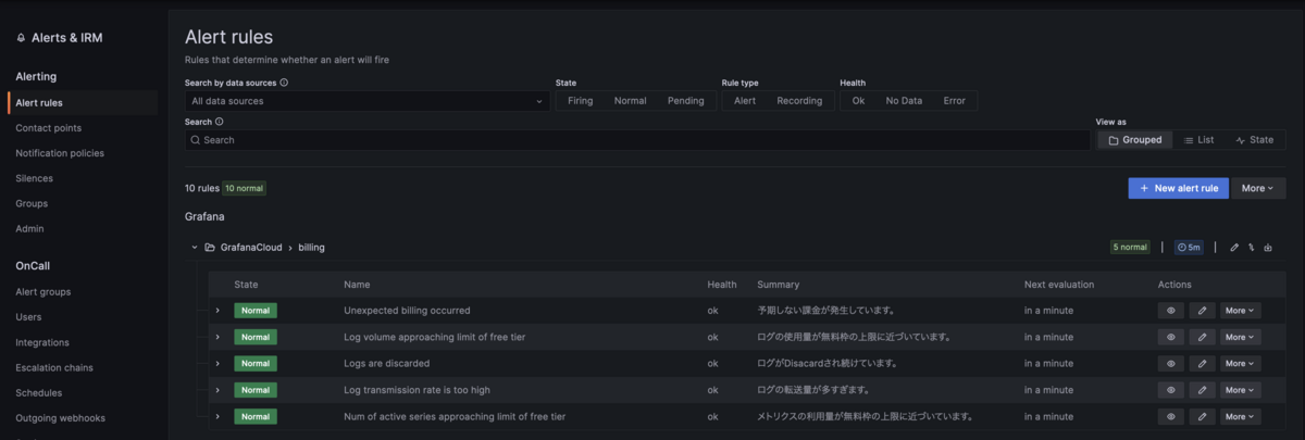 2023-09-23 追記 grafanacloud-usage datasourceが1日に1回くらいの割合でNoDataになってアラートを飛ばしてくるので、NoDataになったときの挙動をOKにしてしまうのがおすすめです。どうせNoDataになってもユーザ側で対応できることは何もないので、それで十分だと思います。